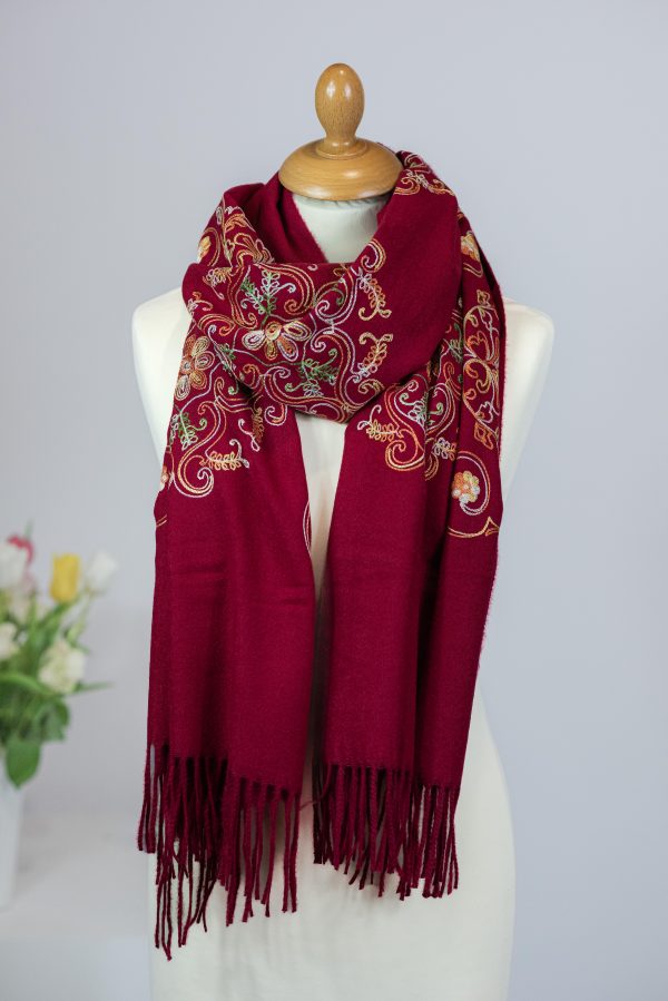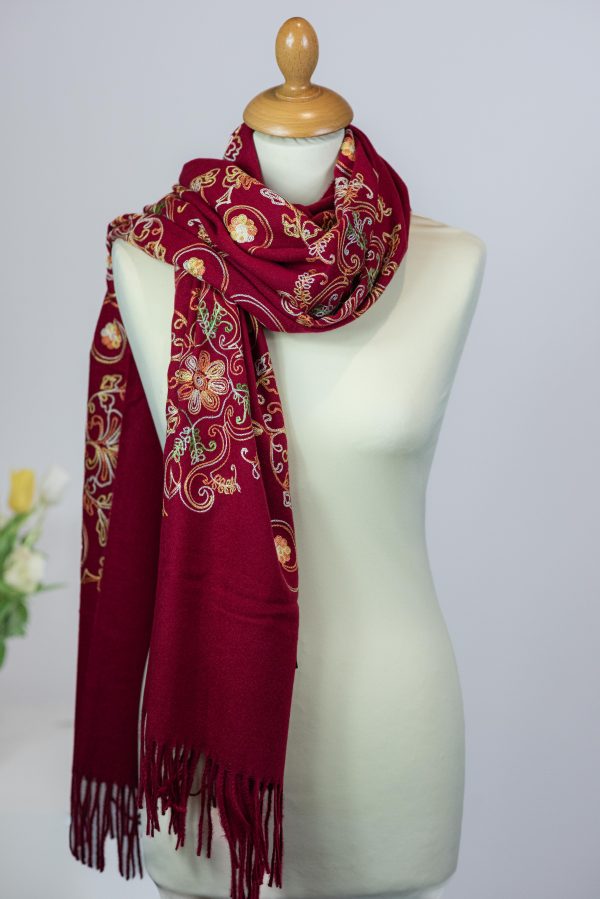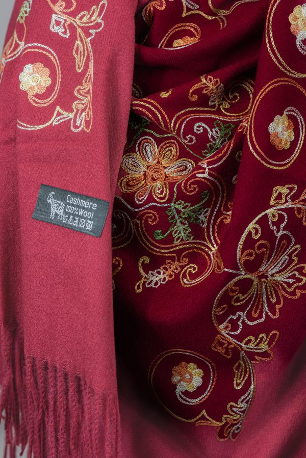 Erleben Sie unvergleichliche Weichheit und Wärme mit diesem bordeauxroten Damen-Schal aus 100% reiner Kaschmirwolle. Handgefertigt in Indien, besticht er durch detailreiche Ethno-Stickerei mit traditionellen Motiven in Gold-, Beige- und Grüntönen. Die kunstvollen Muster auf dem tiefroten Hintergrund machen diesen Schal zu einem echten Blickfang. Die hochwertige Verarbeitung und Materialien garantieren Langlebigkeit. Dieser vielseitige Kaschmirschal ist das perfekte Accessoire für jedes Outfit.