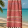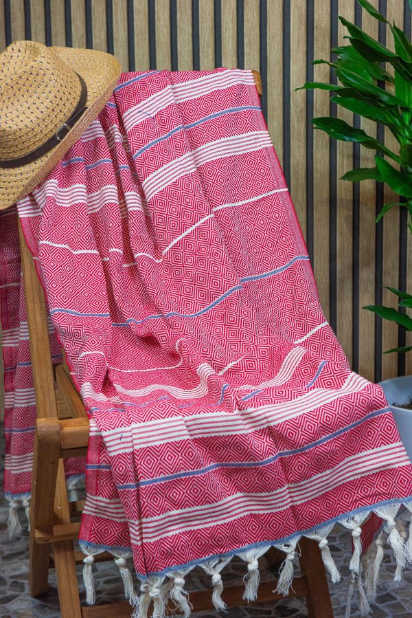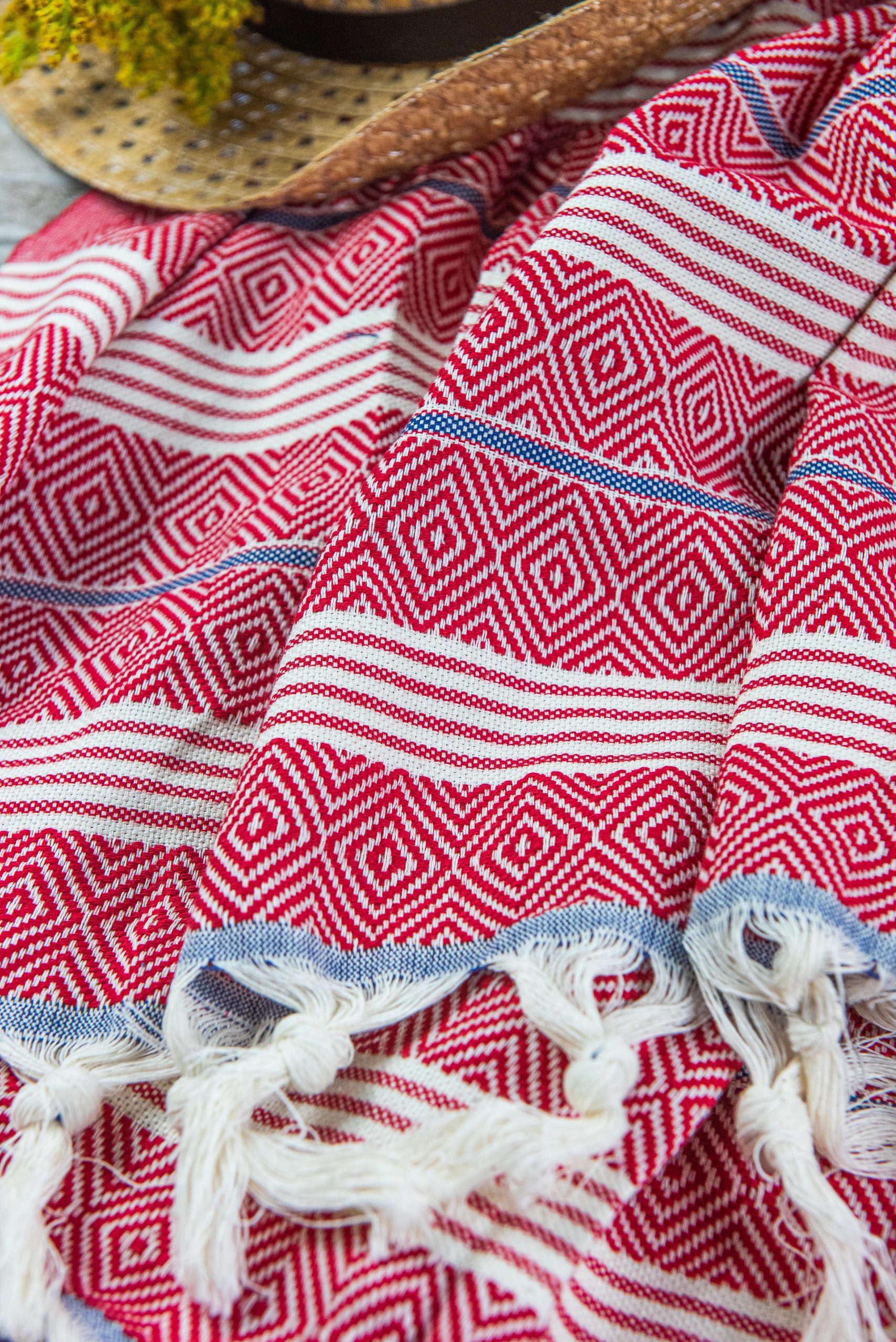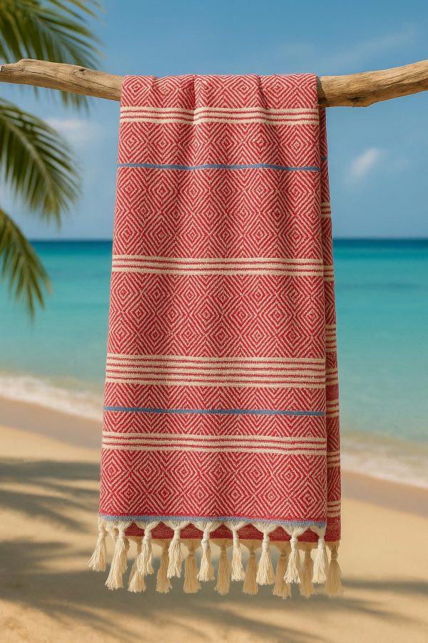 Dieses extra leichte Hamamtuch vereint zeitlose Eleganz mit funktionaler Vielseitigkeit. Die harmonische Kombination aus warmem Rot, zarten Cremeweiß- und feinen blauen Akzenten verleiht ihm eine stilvolle und lebendige Ausstrahlung. Es ist aus 100 % reiner Baumwolle gefertigt, besonders dünn und angenehm leicht – perfekt für Sauna, Pool und Strand. Durch seine hohe Saugfähigkeit und schnelle Trocknung ist es ideal für unterwegs und immer einsatzbereit. Ob als klassisches Hamamtuch, als stilvolle Decke oder als Yogamatten-Unterlage – dieses Tuch verbindet Komfort und Stil und ist ein unverzichtbares Accessoire für aktive Menschen, die Qualität schätzen.